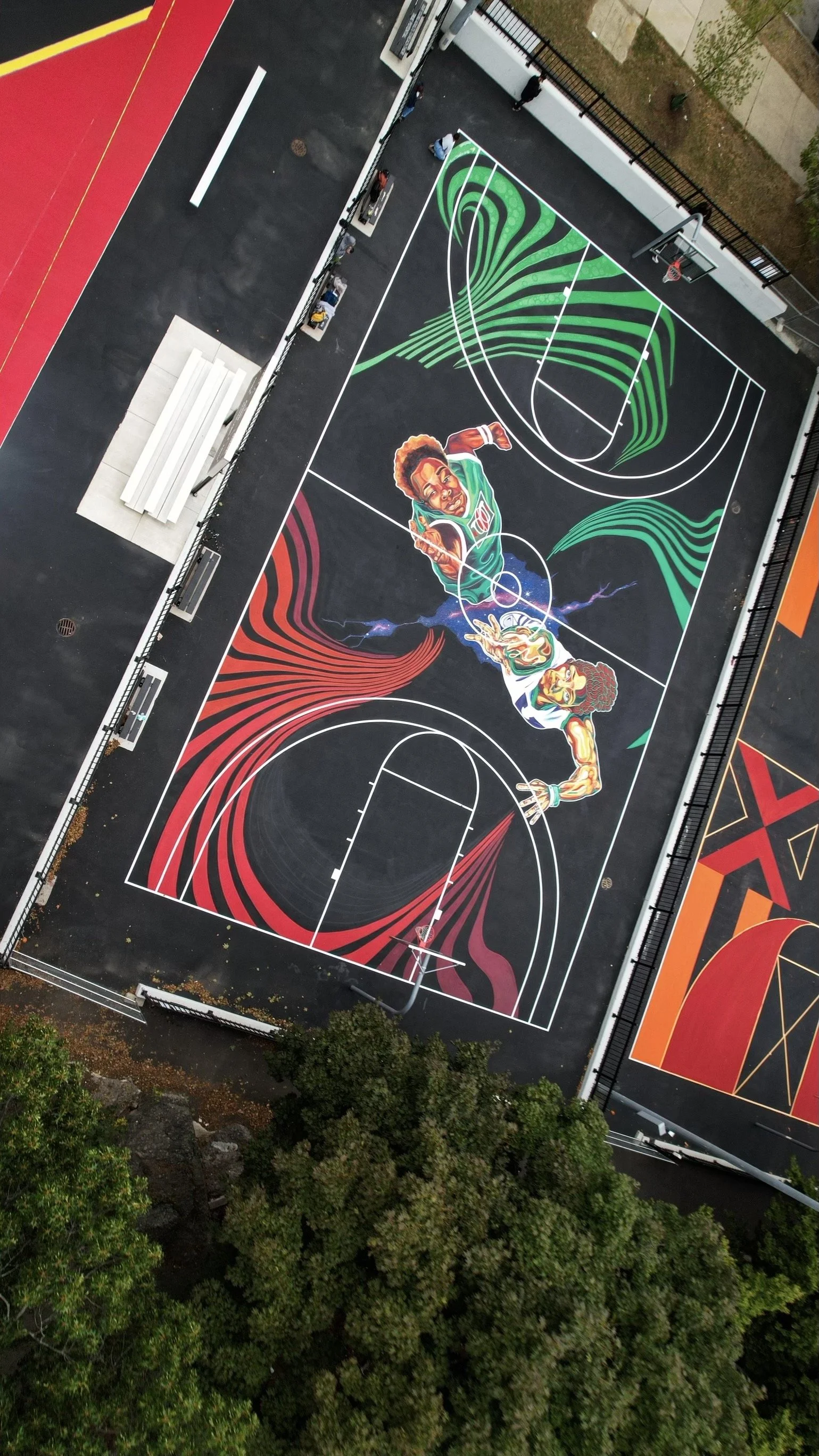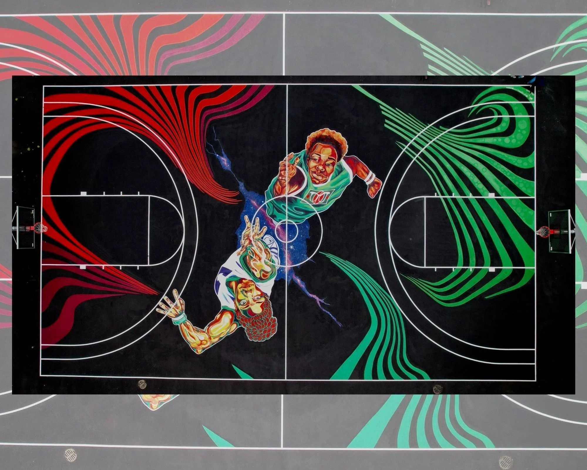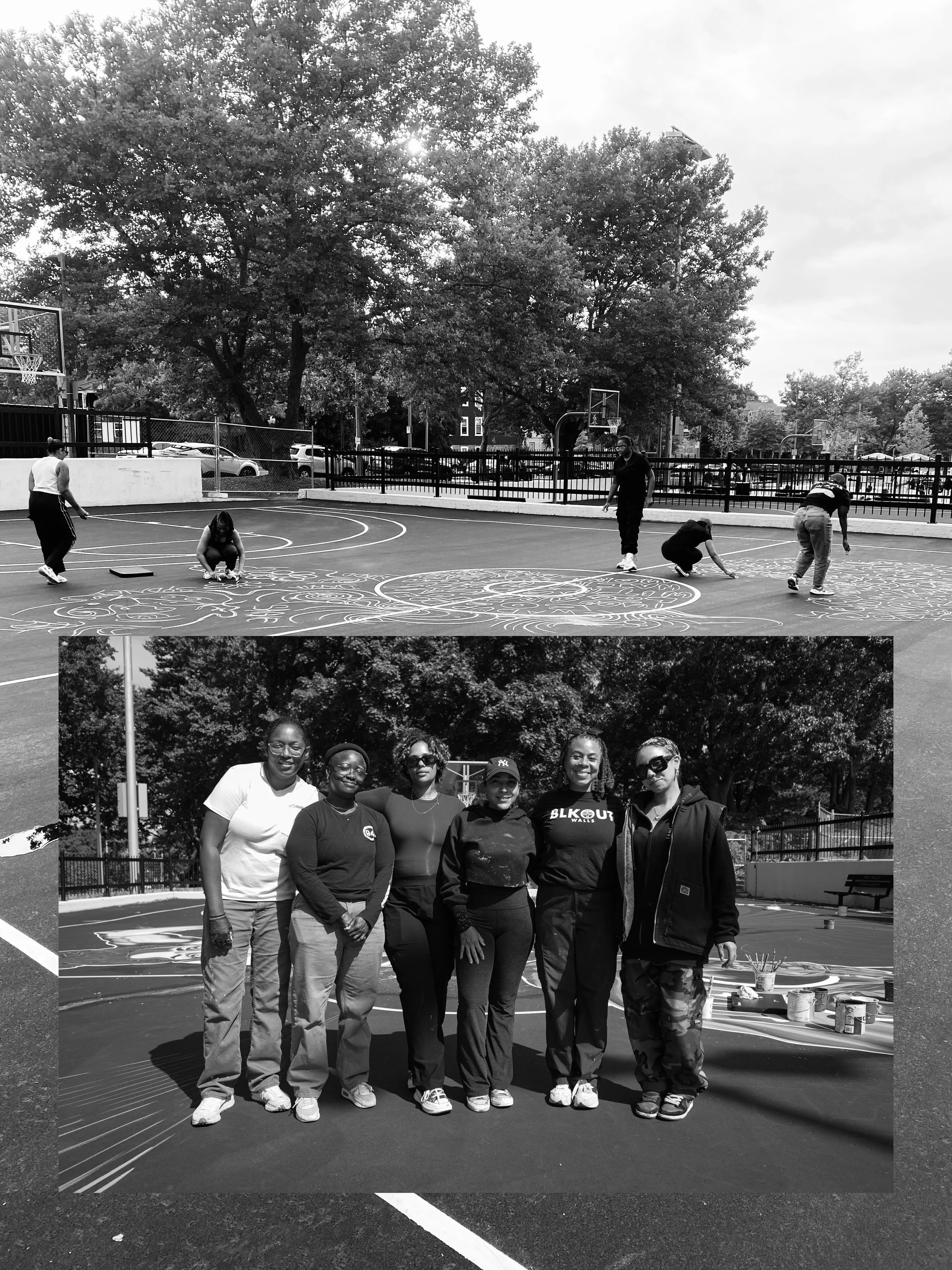Anything Under the Suns is a vibrant basketball court mural created to honor the legacy of Malcolm X, located in the heart of Roxbury at Malcolm X Park. This collaborative piece was led by acclaimed artist Sydney G. James and brought to life by a talented team of women artists: Gina Latham, Nadeea Harvin, Sharinnaa Travioso, Ijania Cortez, and Sage Vangelina De La Cruz.