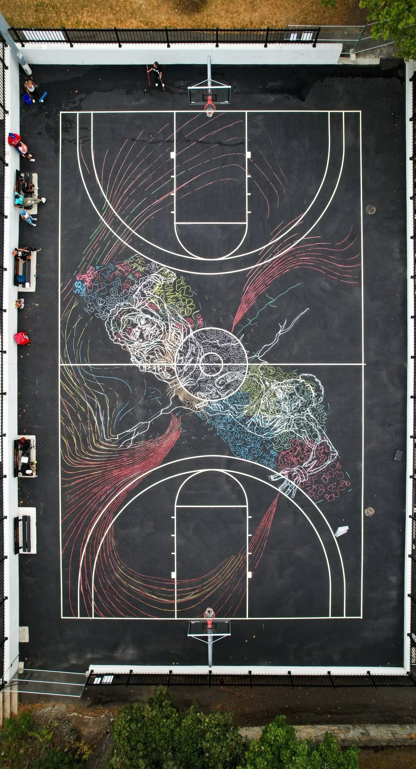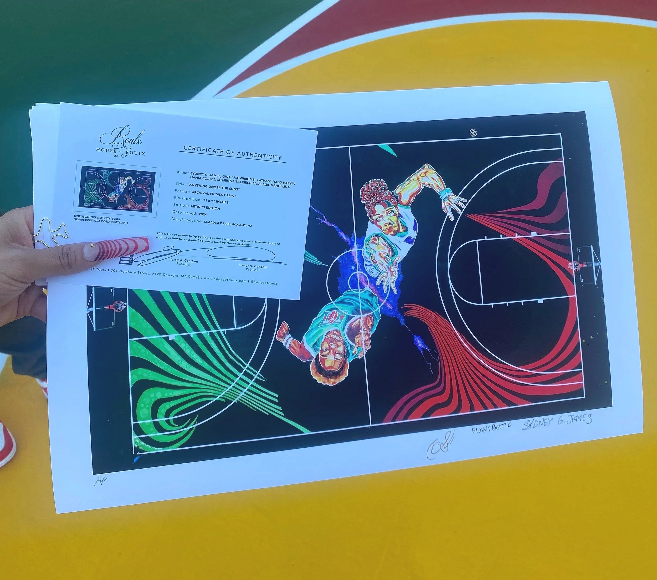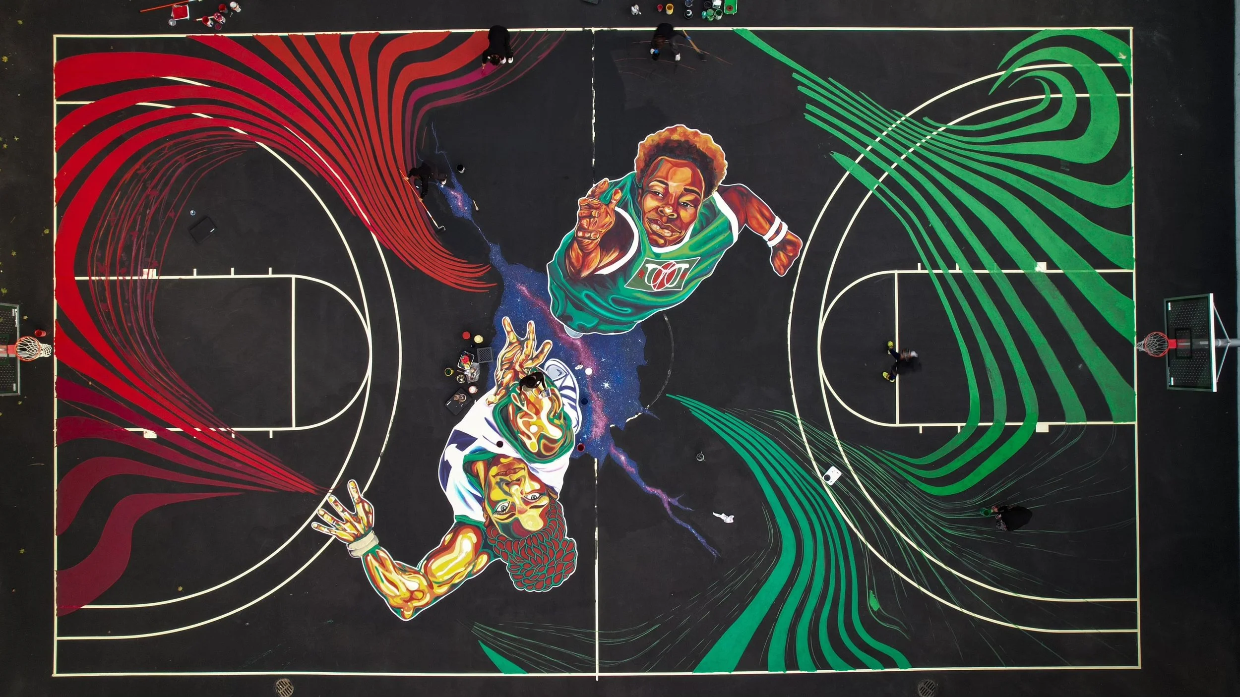 Anything Under the Suns is a vibrant basketball court mural created to honor the legacy of Malcolm X, located in the heart of Roxbury at Malcolm X Park. This collaborative piece was led by acclaimed artist Sydney G. James and brought to life by a talented team of women artists: Gina Latham, Nadeea Harvin, Sharinnaa Travioso, Ijania Cortez, and Sage Vangelina De La Cruz.